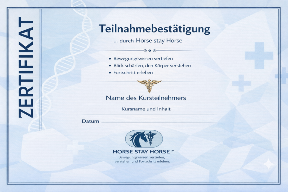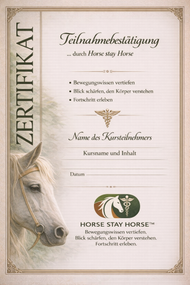 Nach acht Wochen wird der Kurs mit einem Zertifikat zur Selbstausbildung benotet und abgeschlossen – nur für die Person und das Pferd.